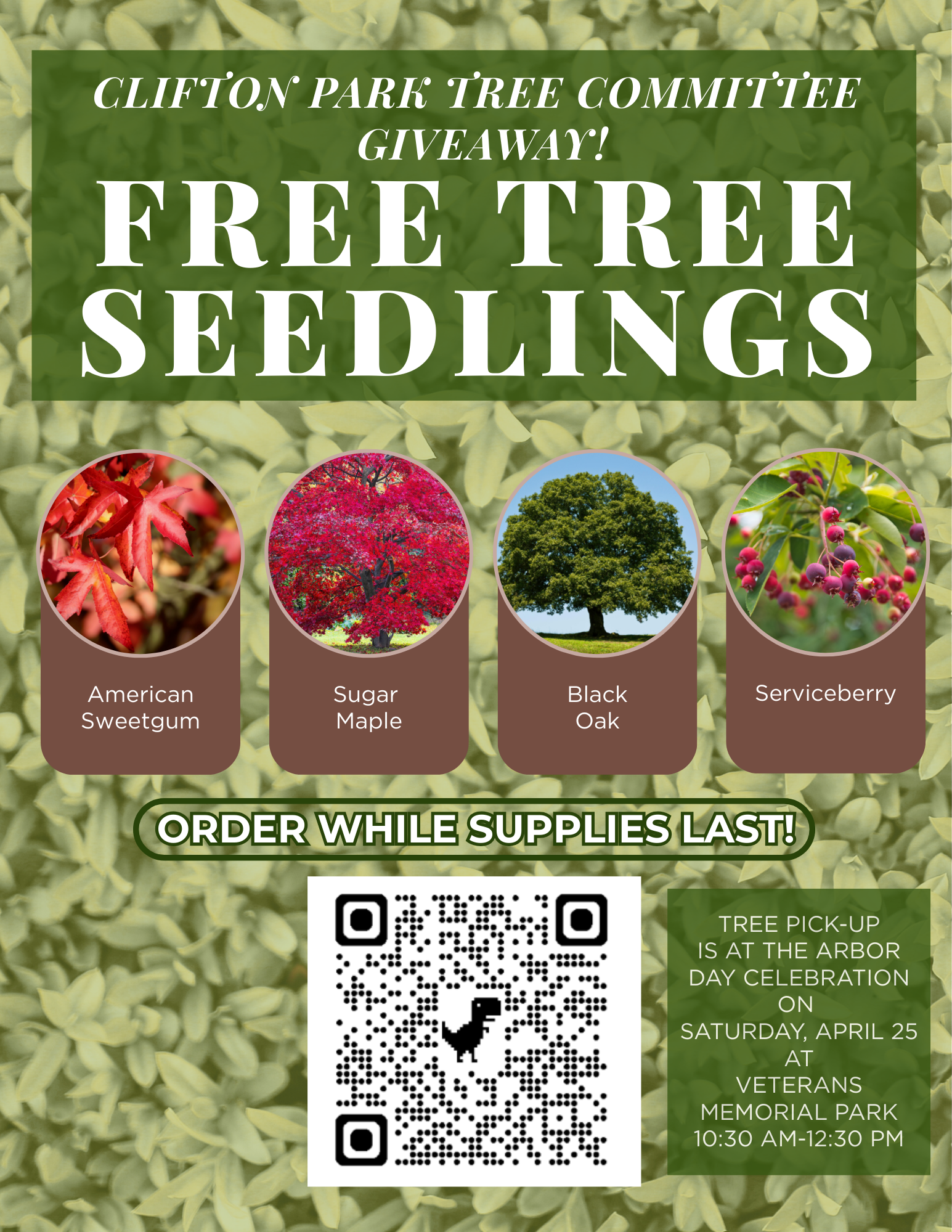 The Clifton Park Tree Committee is giving away free tree seedlings (while supplies last). Order yours today and pick up at the Arbor Day Celebration on Saturday, April 25th from 10:30am-12:30pm at Veterans Memorial Park.