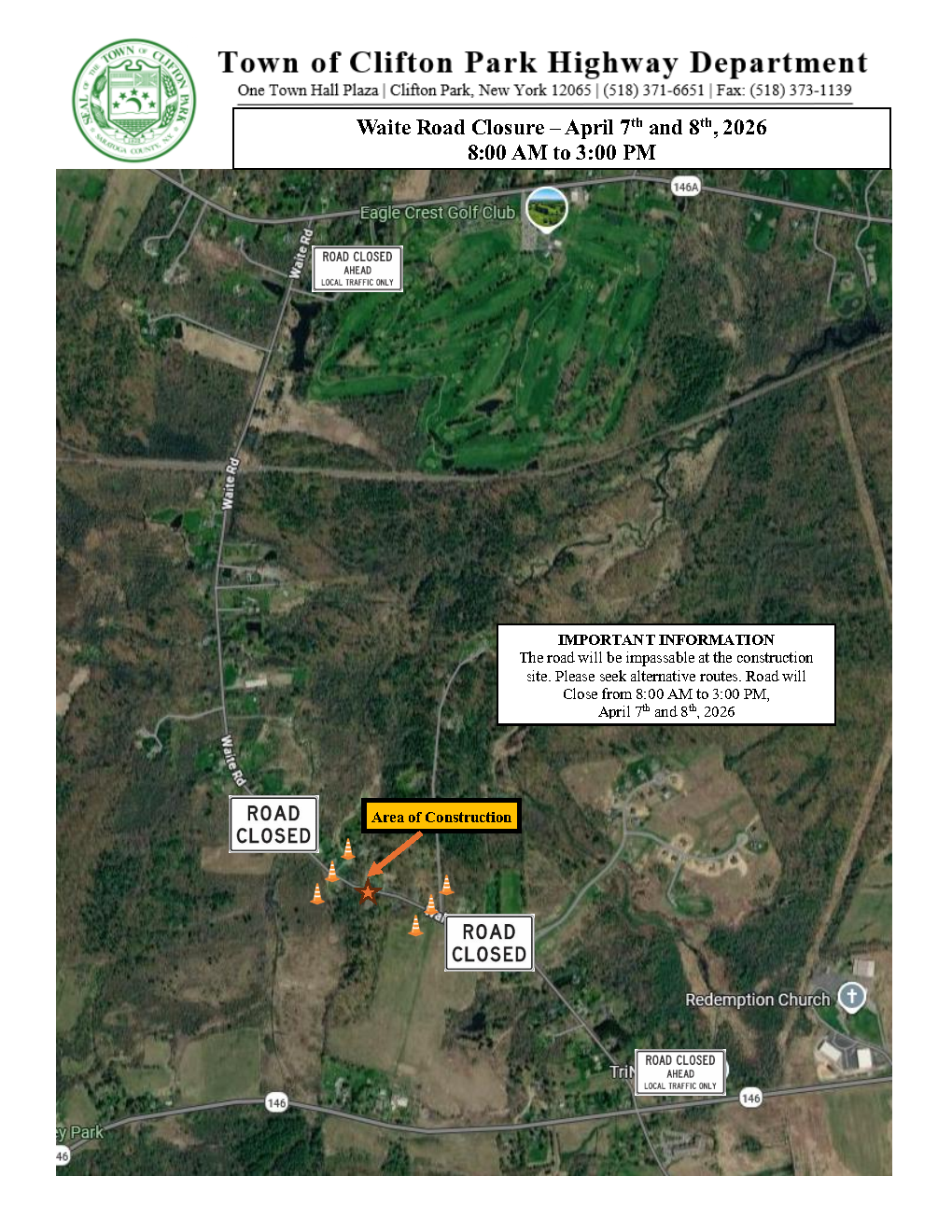 Clifton Park, NY -- Clifton Park Highway Superintendent Dahn Bull announced that Waite Road, between the Waite Road Railroad Tracks and the intersection of Waite Road and State Route 146 will be temporarily closed on Tuesday and Wednesday, April 7th and 8th. The work being completed is the replacement of a large culvert pipe. Work will occur between the hours of 8:00 AM and 3:00 PM, during the hours of least traffic in the area.