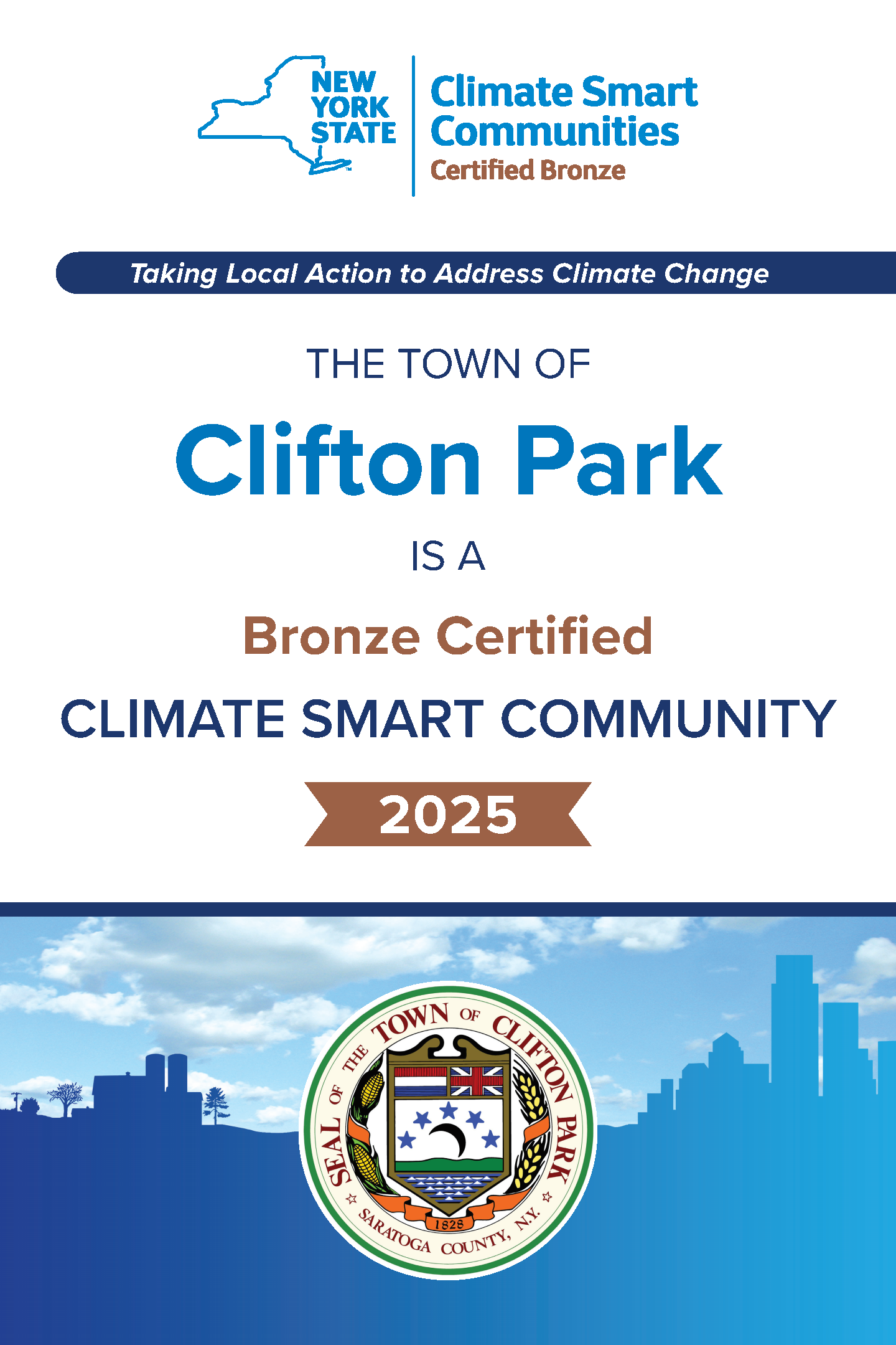 In September 2025, New York State Department of Environmental Conservation announced that the Town of Clifton Park achieved Bronze Certification in New York State’s Climate Smart Communities Certification program through active participation with the GREEN Committee. The program supports local efforts across the state to meet the economic, social, and environmental challenges posed by climate change. To be certified, communities must demonstrate an active task force, which includes residents and municipal representatives, to lead the charge and advance local climate action. The Clifton Park Climate Smart Community Task Force is made up of members of the GREEN Committee and Town employees.